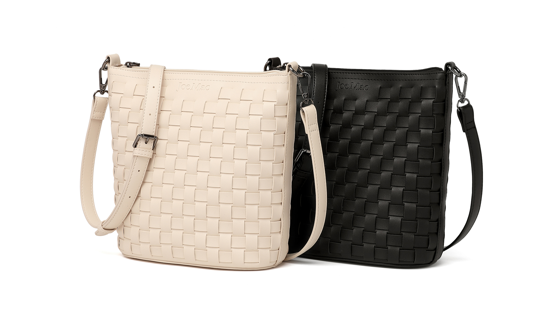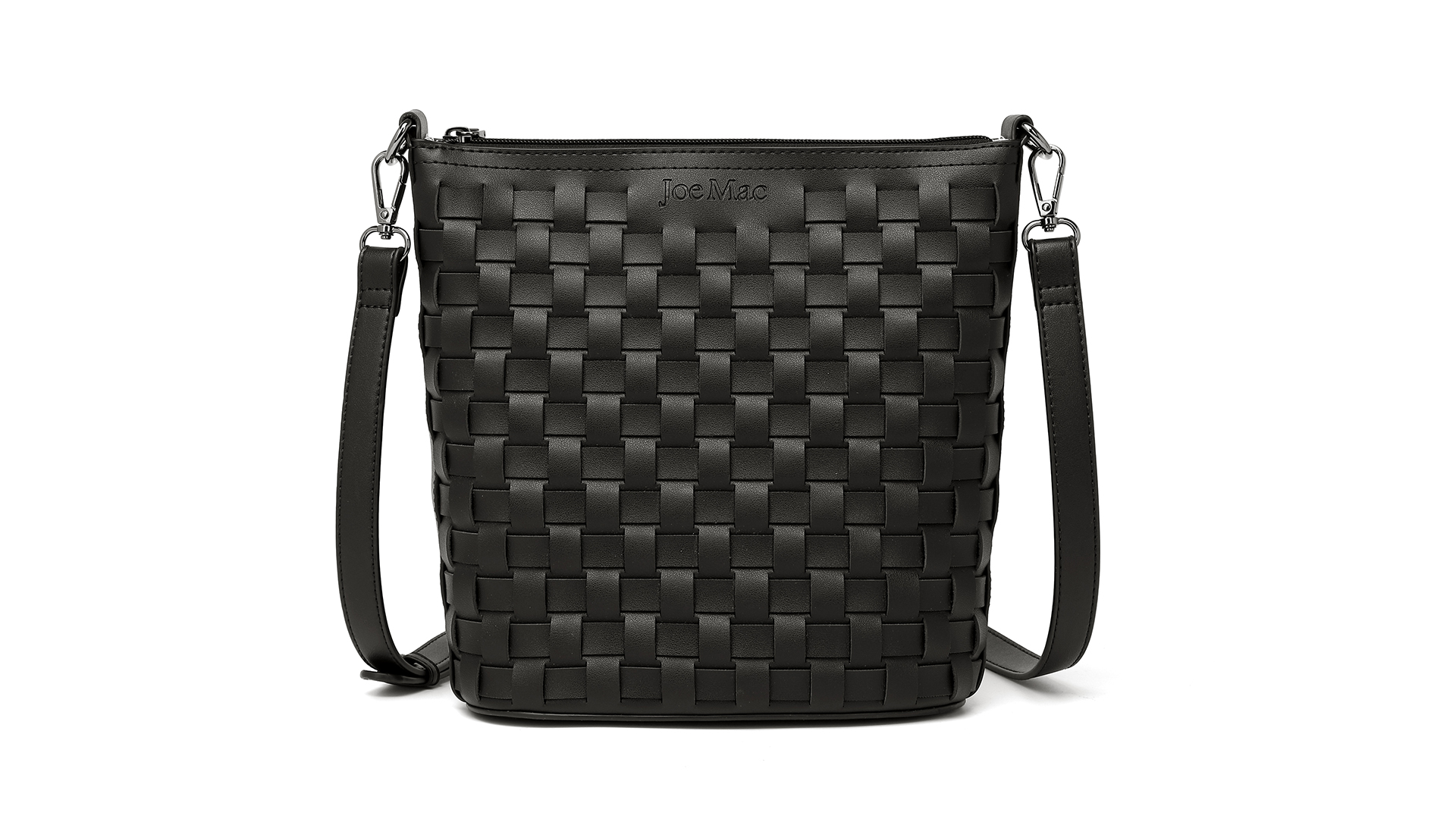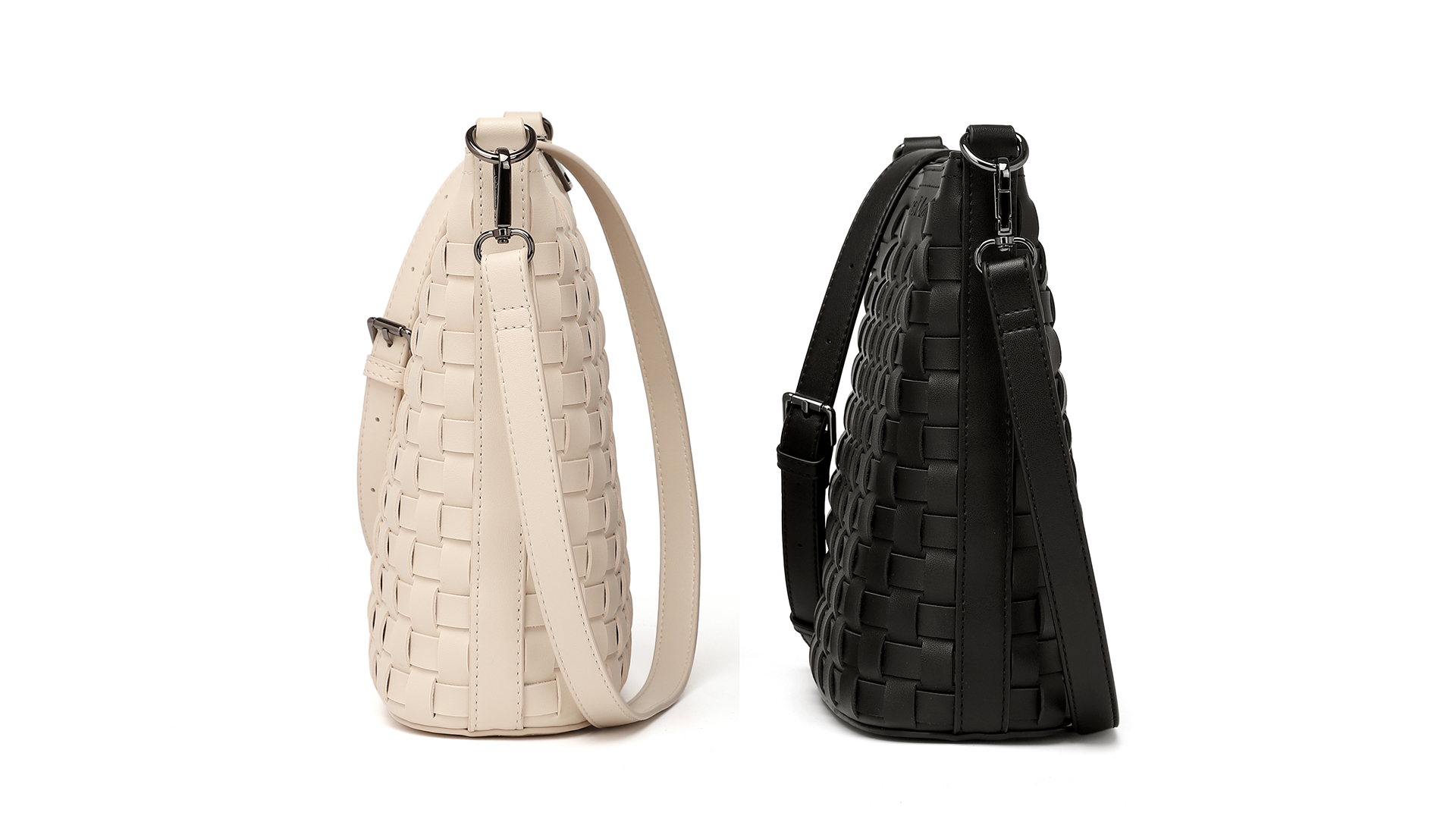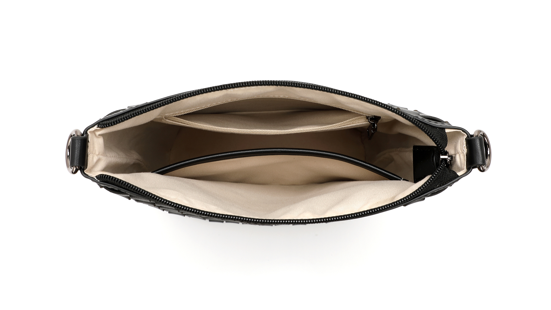 Ålborg, en lätt och smidig väska för dagligt bruk, elegant design med flätade sidor. Ljus inredning med dubbla innerfickor, en med blixtlås och en öppen med förstärkt överkant. Blixtlåsförslutning i väskans topp. Justerbart långband för bekväm bärning över axel eller crossover. Alla metalldetaljer i mörk silverfärg.