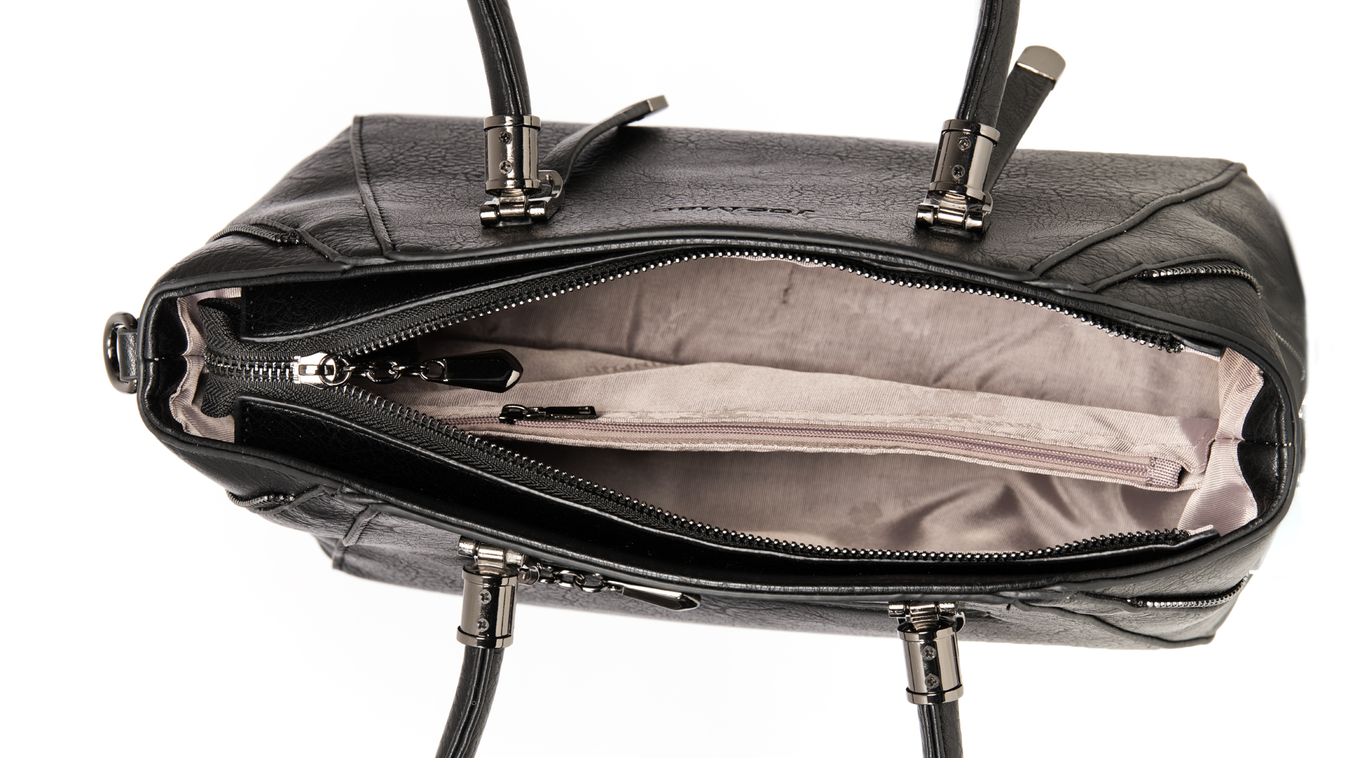 DUBLIN, modern design från Joe Mac. Specialdesignade gavlar för att väskan skall bli rymlig och lättarbetad. Mittenfacket 23 cm långt med blixtlås, ena sidan invändigt har en tvådelad ficka och den andra sidan en blixtlåsförsedd ficka. På väskans baksida finns en ficka som försluts med blixtlås.
