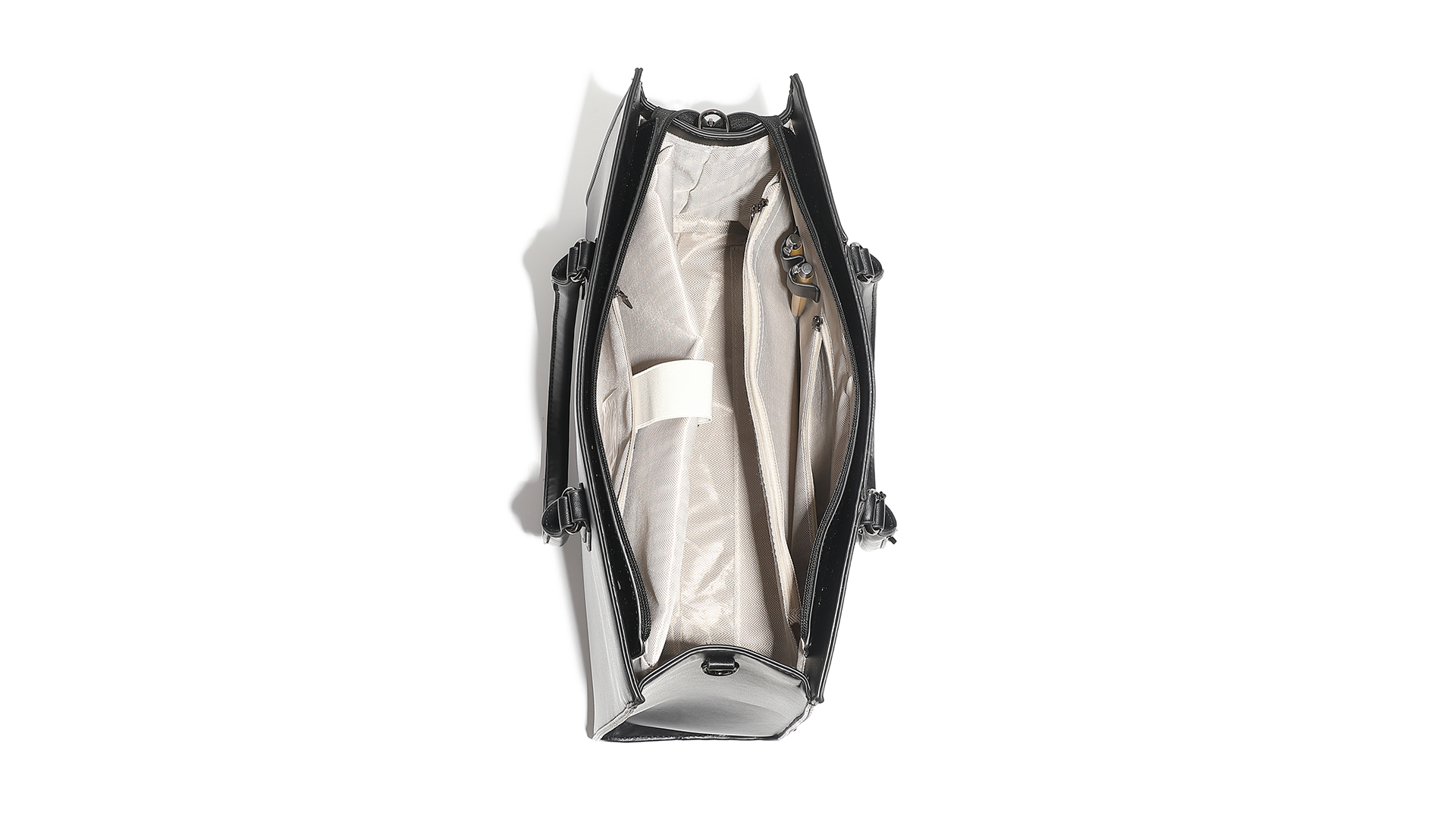 Samtliga metalldetaljer i “gun-metal” och under väskan finns fyra stycken tassar av metall som skyddar väskan vid nedställning.