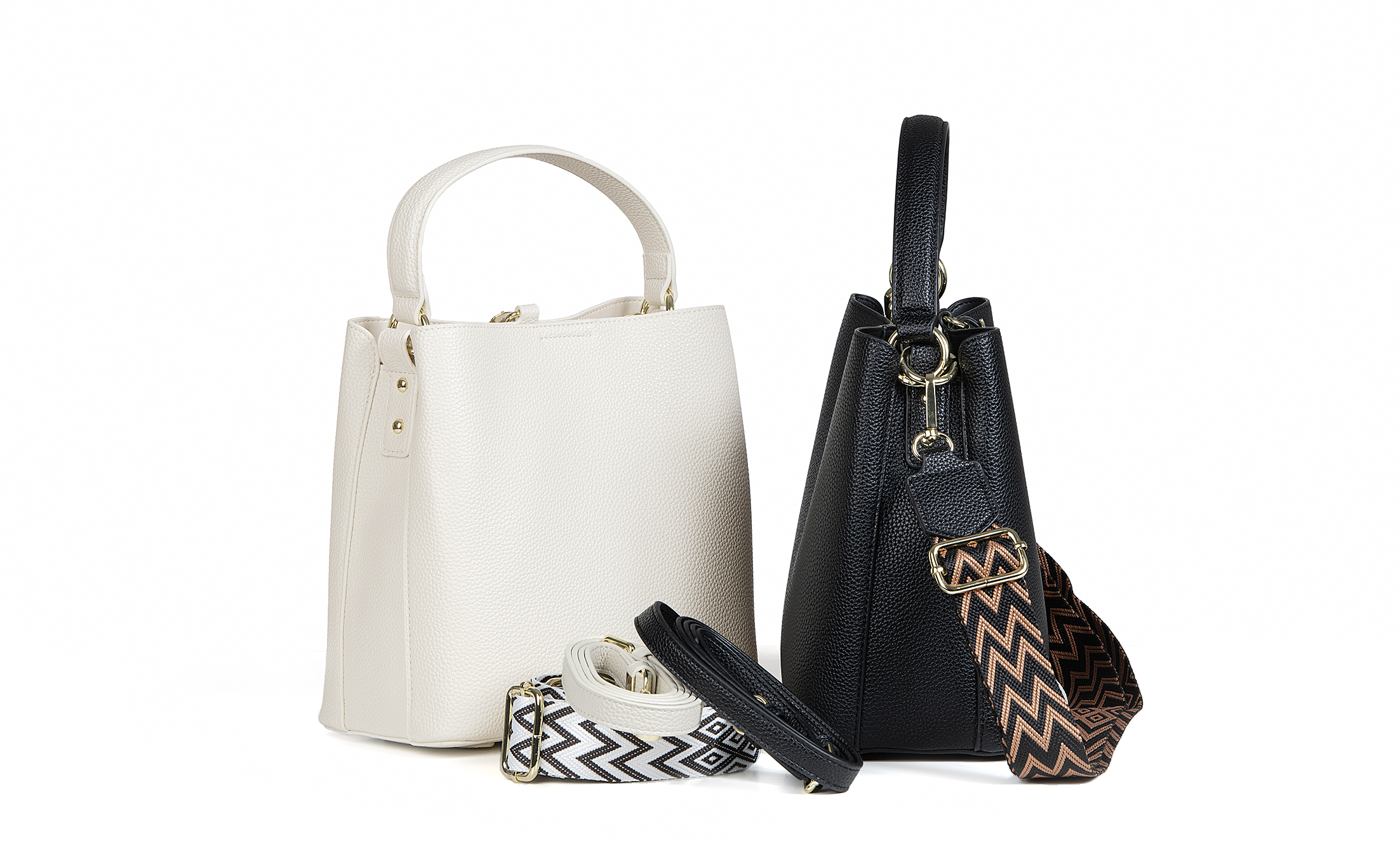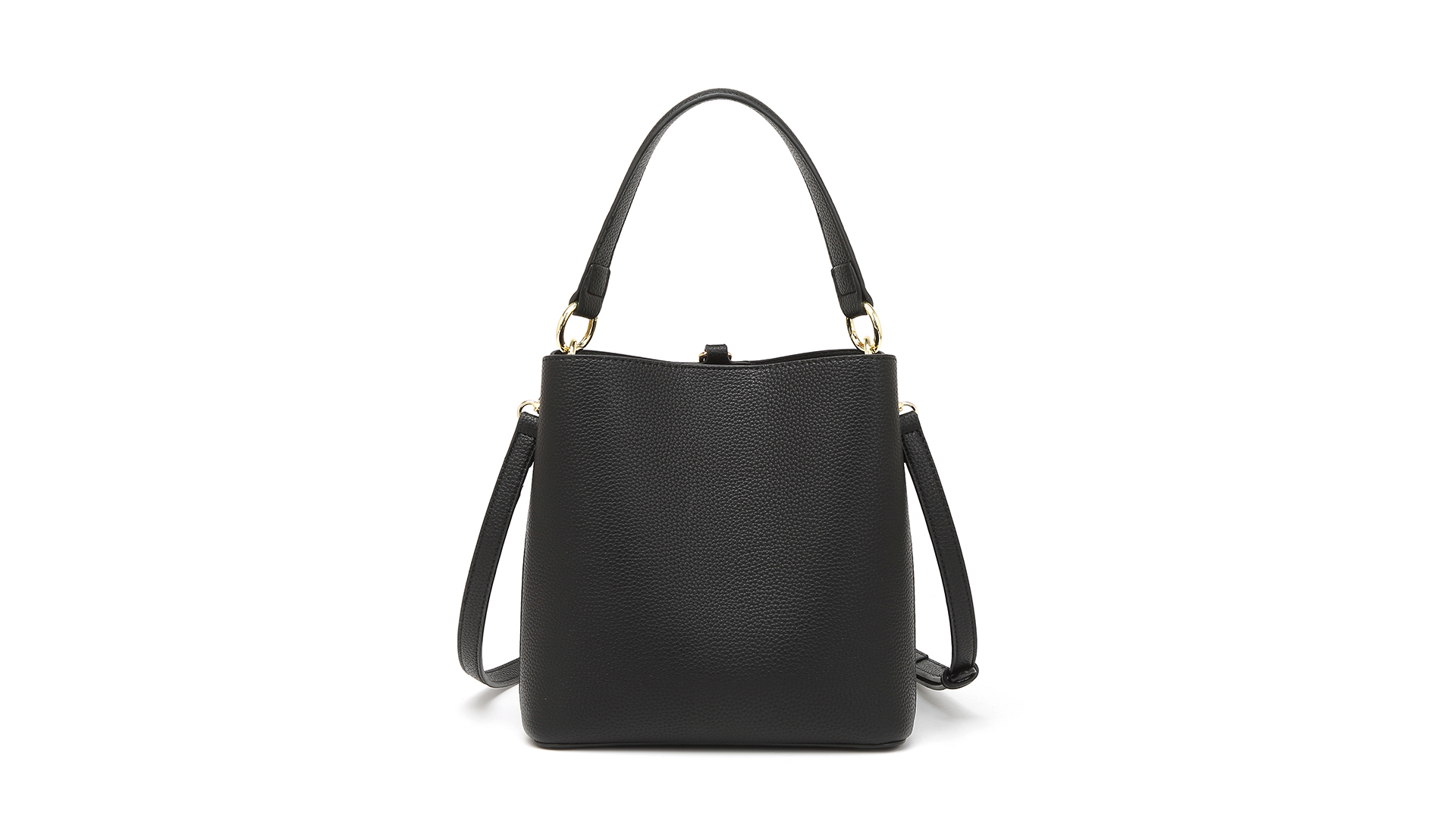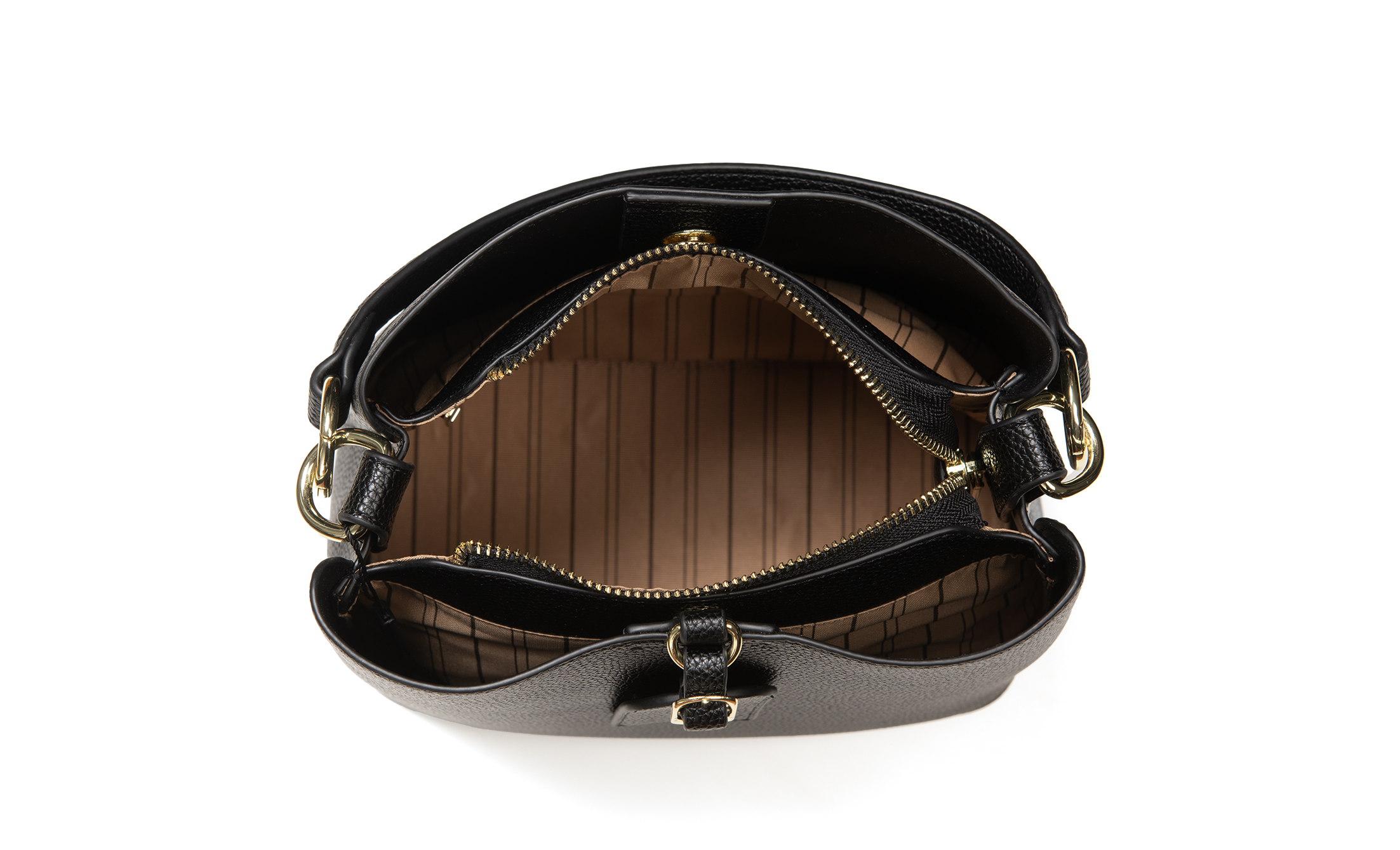 Ett kort band att bära väskan i handen (Kan kopplas bort) och två långa band att bära väskan över axel eller crossover, det ena bandet lite bredare i textil och det smalare i polyurethan. Väskans inredning i ljust material. Alla detaljer i metall är guldfärgade.